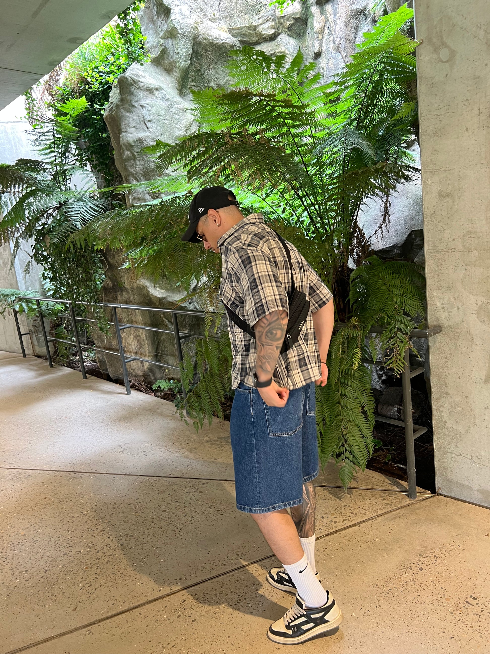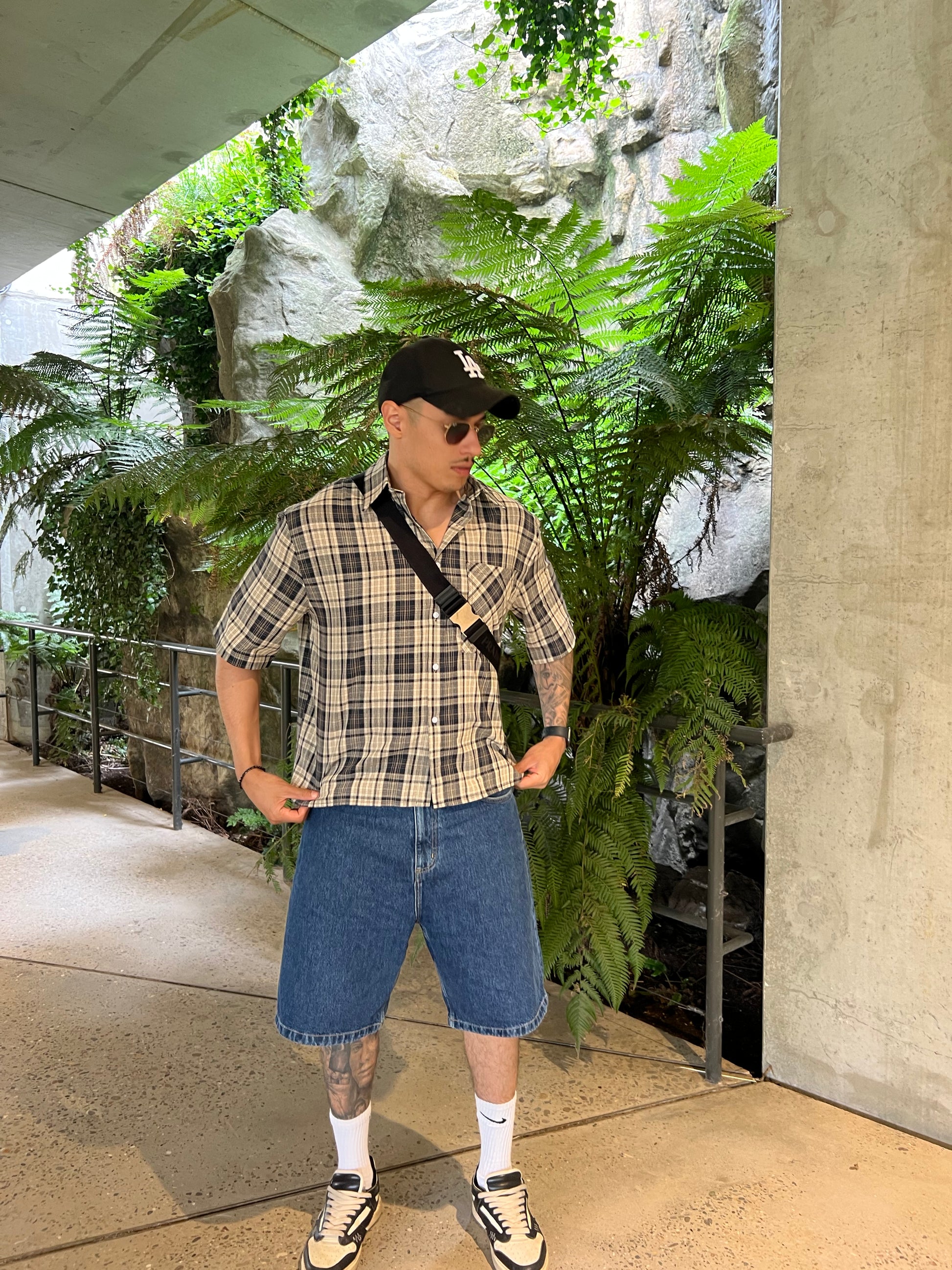 This boxy-fit shirt features a structured silhouette with a cropped cut and sharp shoulders. Crafted from premium cotton with a refined beige and navy plaid, it combines a crisp look with breathable comfort. Complete with a classic collar, front button closure, and single chest pocket, it’s a standout piece for a modern, elevated casual style.